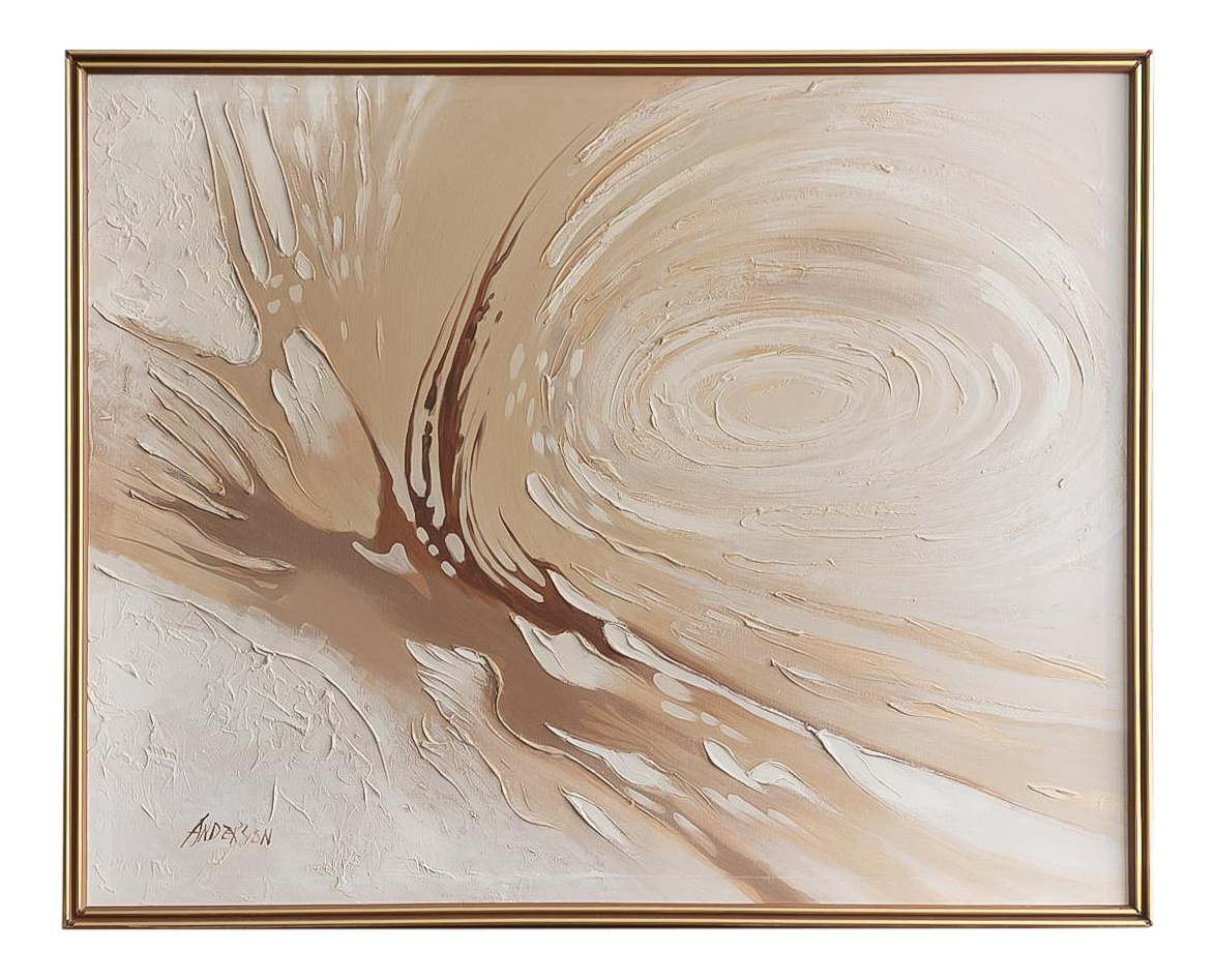 1960s original large abstract oil on canvas by anderson. 1960s original large abstract oil on canvas by anderson. Good condition with original frame. The painting shows texture and great earth tone colours. 1960s original large abstract oil on canvas by anderson fabulous textural impasto piece that would compliment any large wall.