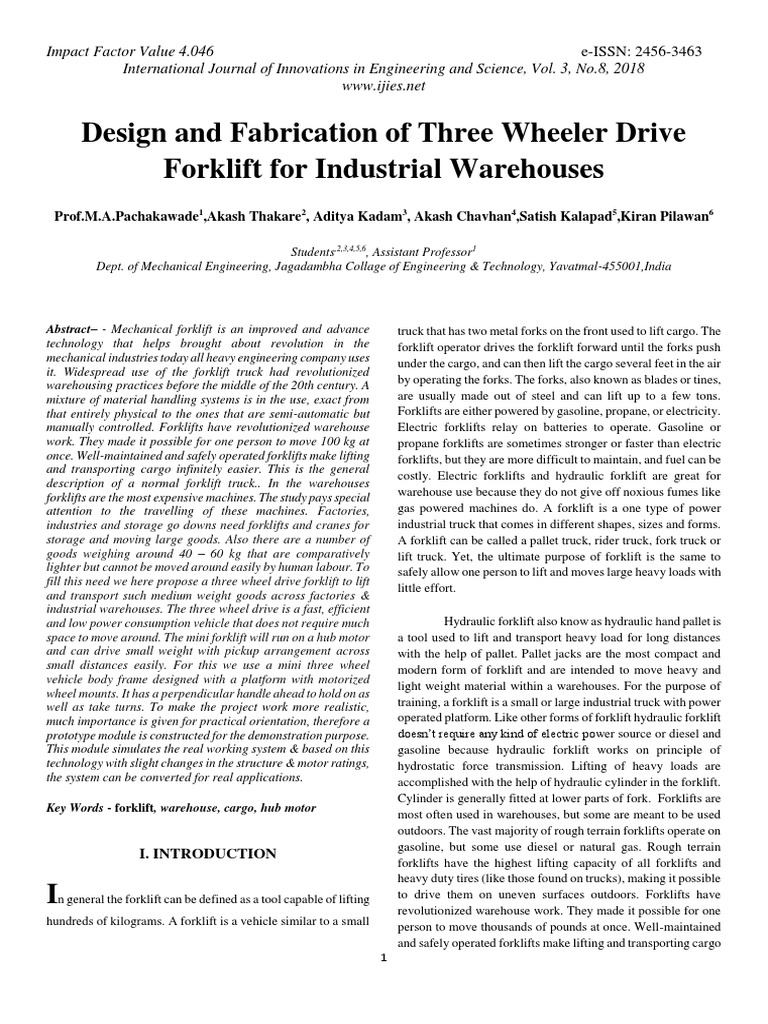 Pdf Design And Fabrication Of Three Wheeler Drive Forklift For