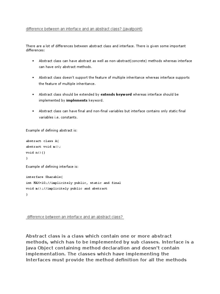 For example the abstract class tree and subclass banyantree has all the characteristics of a tree as well as characteristics that are specific to the banyan tree. Understanding the differences between an abstract class and an interface is essential. Till java 7 version an interface in java is a pure abstract class which means all methods are abstract and variables are constants by default all methods inside interface are public abstract and variables are public static final interface is a mean to achieve full abstraction in java. The default visibility of class constants is public.