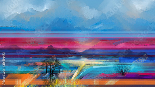 Abstract Oil Painting Landscape Colorful Blue Purple Sky Oil