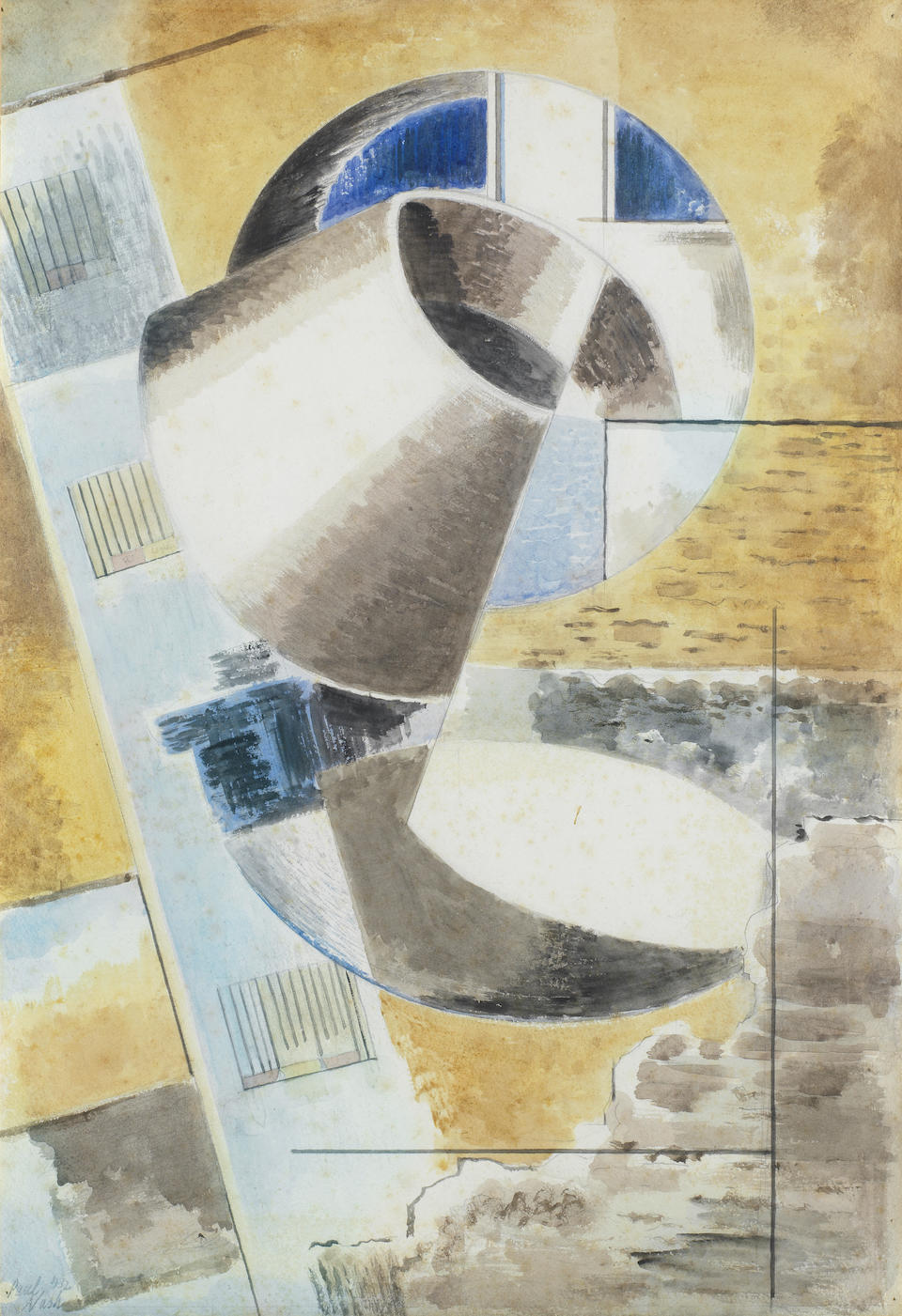 Edward wadsworth abstract composition 1915. He painted often in tempera coastal views abstracts portraits and still life. Please edit this file description and provide a source. A dark yellow triangular prism with a curved side provides a vertical focus and splits the composition in two.