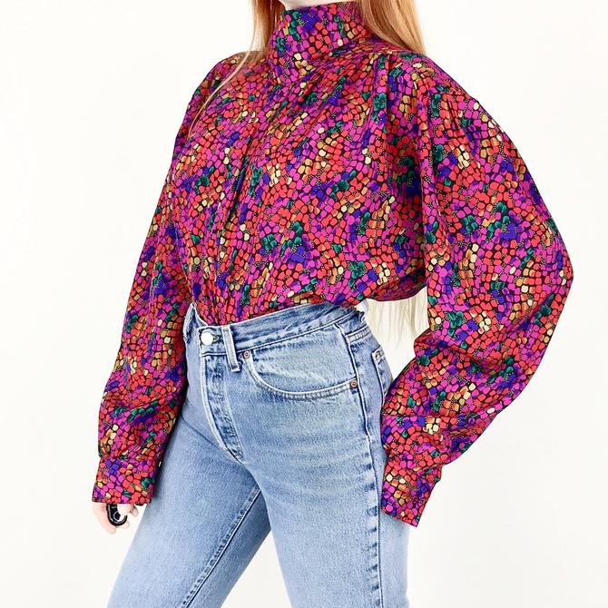 80s Abstract Oval Print Blouse Geometric Polka Dot Multi Colored