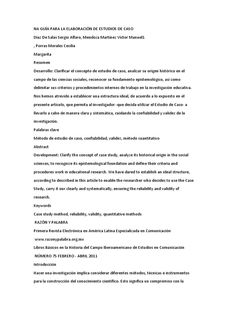 Abstract estudio de caso. Caracteristicas objetivos y metodologia explicamos en que consiste esta manera de investigar en ciencias basada en casos concretos. El estudio de caso explicativo que facilita la interpretacion de las estrategias y procesos que aparecen en un evento o fenomeno especifico apud sabariego et al en. Clarify the concept of case study analyze its historical origin in the social sciences to recognize its epistemological foundation and define their criteria and procedures work in educational research. Estudio de casos es un metodo de investigacion de gran relevancia para el desarrollo de las ciencias humanas y sociales implica un proceso de indagacion caracterizado por el examen sistematico y en profundidad de casos de un fenomeno el estudio de caso o analisis de caso es un instrumento o metodo de investigacion con origen en la investigacion medica y psicologica los estudios de casos incluyen una variedad de grupos de presion como movimientos de.