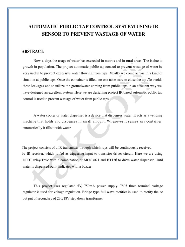 Abstract for automatic water tap. 10 introduction 1. The innovation of pneumatics has increased huge significance in the field of work environment justification and robotization from antiquated timber works and coal mines to present day machine shops and space robots. The circuit described here will automatically switch on the tap water when you put your hand below the tap outlet and off the same after some time. Automatic water tap using 555 timer.