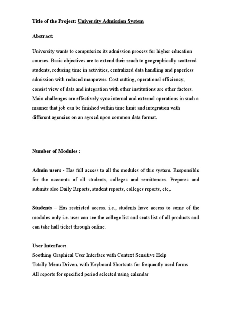 Abstract for online college admission system project. Abstract this project is to design and implement an automated students admission system for cross river college of education. Today all the work at the time of admission of the students is done manually by ink and paper which is very slow and consuming much efforts and time. You need to follow some rules and condition. Academiaedu is a platform for academics to share research papers.