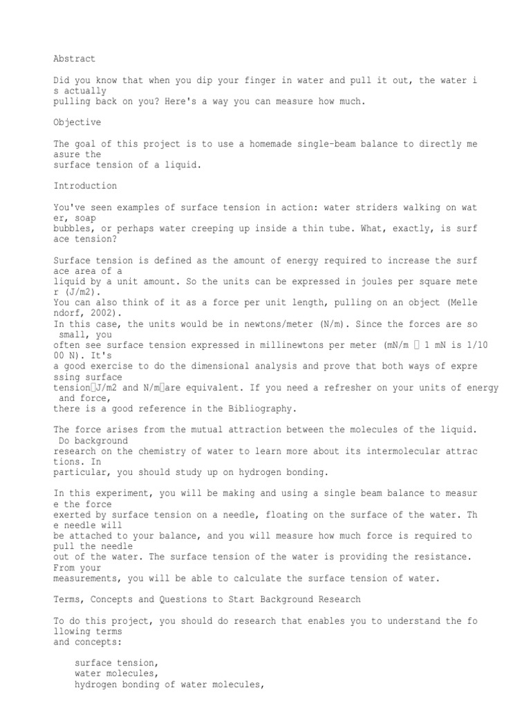 Measuring The Surface Tension Of Water Science Project