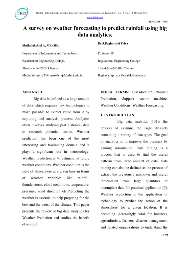 A Survey On Weather Forecasting To Predict Rainfall Using Big Data