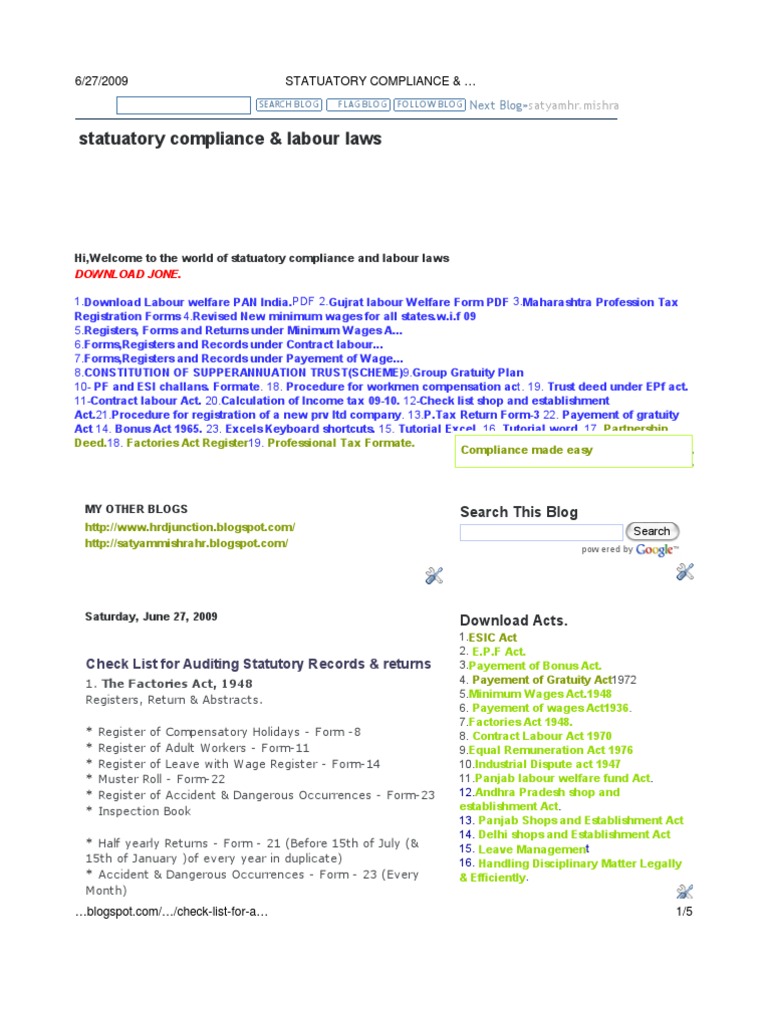 Statuatory Compliance Labour Laws Check List For Auditing