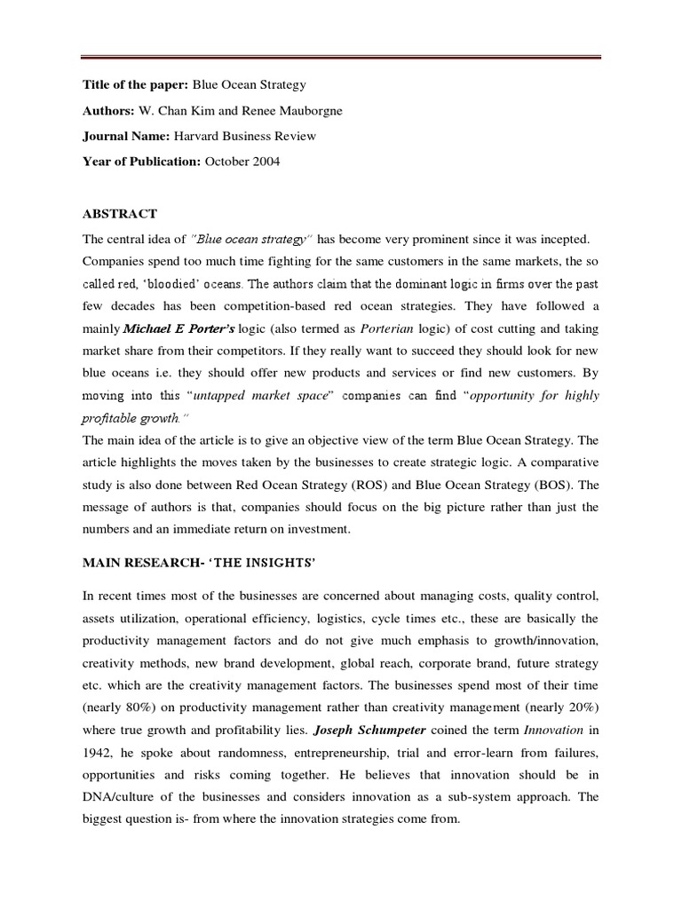 Summary Of Blue Ocean Strategy Kim Mauborgne Abstract