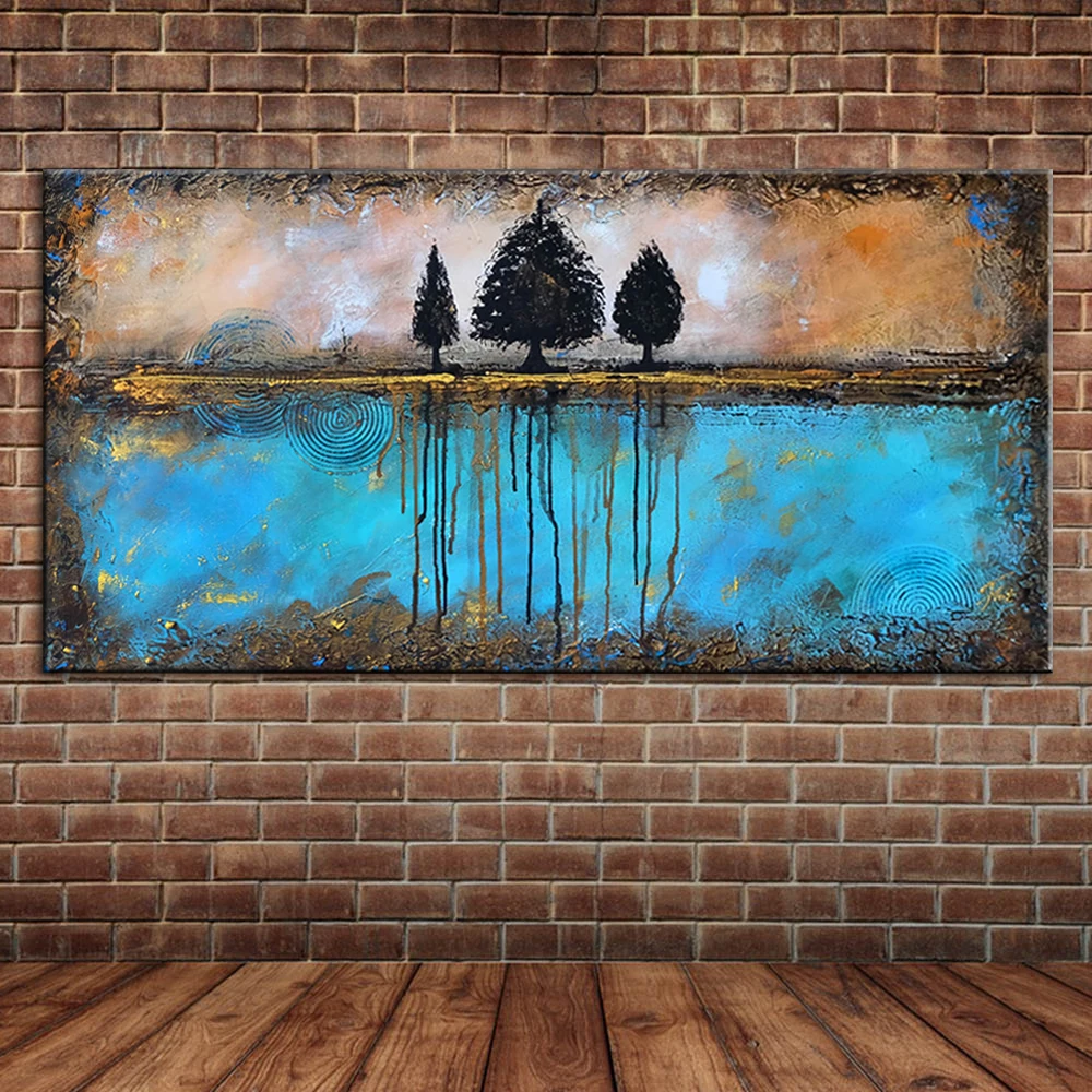 Abstract Trees Blue Water Hand Painted Oil Painting Brown Sky