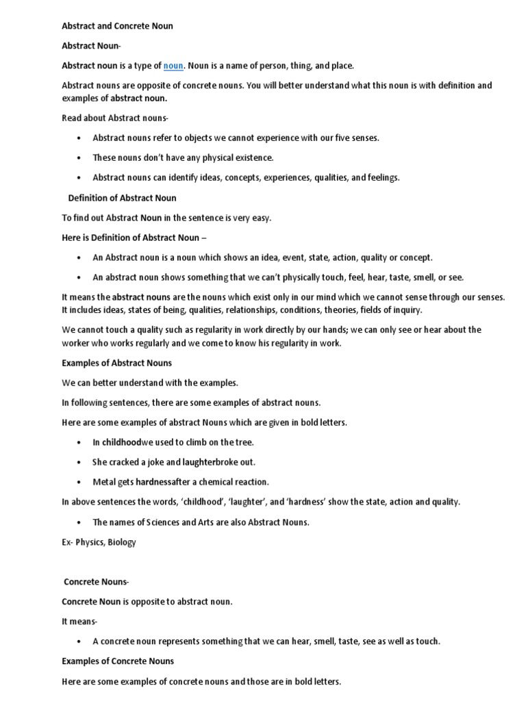 Qualities relationships theories conditions and states of being are some examples of the types of things abstract nouns define. Only concrete concepts represent physical entities defined by spatial boundaries and perceivable attributes. Abstract nouns and concrete nouns are usually defined in terms of one another. However physicality as the distinguishing factor is un satisfying.