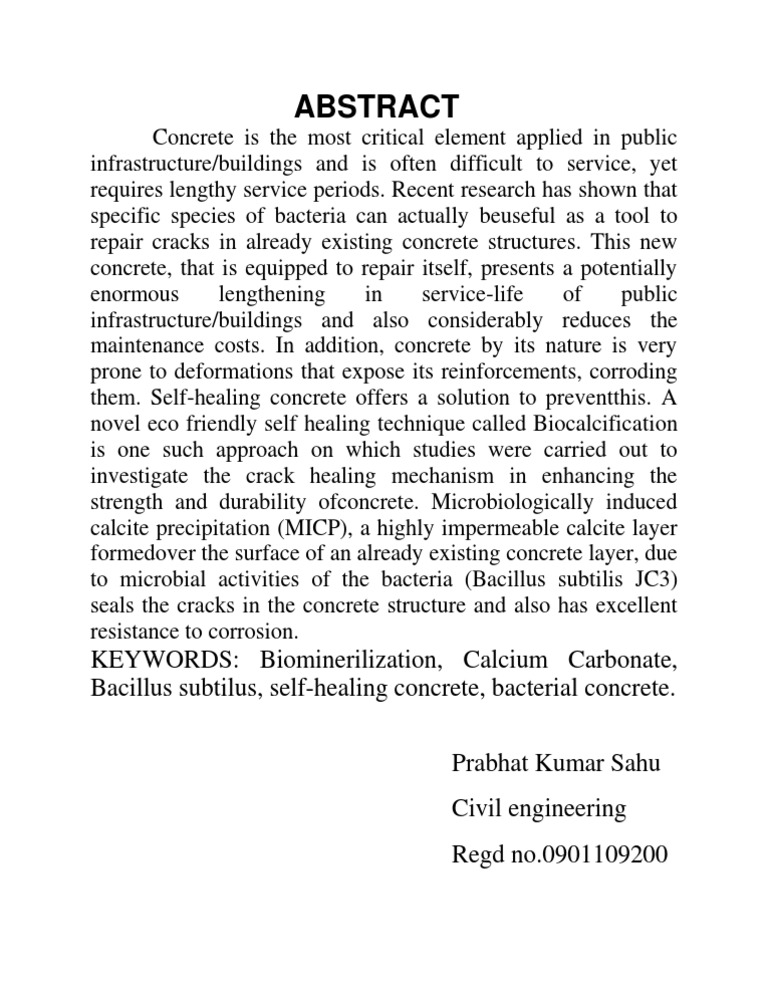 Self healing concrete abstract. In this paper peptone yeast extract and bacillus subtilis were added as microbial adjuvant in concrete mix design. Self healing concrete seminar report. Concrete is very good material to resist the compressive load to a limit but if the load applied on the. According to the analysis and study by different authors that the cracks healed by.